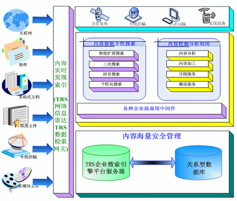 TRS公司推出的企業(yè)搜索引擎解決方案,利用TRS公司多年來(lái)自主開(kāi)發(fā)的TRS Database Server作為企業(yè)搜索引擎服務(wù)的平臺(tái)。可以將電信企業(yè)內(nèi)外部多種格式、多種介質(zhì)形態(tài)、多種存儲(chǔ)方式的內(nèi)容信息,以實(shí)時(shí)的方式將這些信息進(jìn)行索引。并且在索引的過(guò)程中力求能夠做到準(zhǔn)確,并配合以相關(guān)智能語(yǔ)言技術(shù)做信息的去重、自動(dòng)標(biāo)引等能力。其框架如圖:
