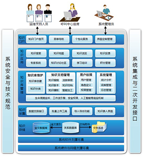 根據(jù)金融業(yè)用戶的需求,TRS運(yùn)維知識(shí)管理平臺(tái)功能框架自下而上可分為知識(shí)存儲(chǔ)、知識(shí)采集、知識(shí)庫(kù)管理、知識(shí)應(yīng)用、知識(shí)門(mén)戶五大功能層,完全覆蓋用戶提出的所有功能需求。并且充分考慮系統(tǒng)安全,遵循技術(shù)規(guī)范,提供對(duì)外集成以及二次開(kāi)發(fā)的接口與服務(wù)。