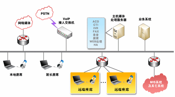 對(duì)于那些地區(qū)分布廣泛,而又要集中管理的單位,可在各個(gè)局部地區(qū)設(shè)置遠(yuǎn)端座席,并通過網(wǎng)絡(luò)方便的接入中心系統(tǒng)。系統(tǒng)為遠(yuǎn)端座席提供與中心座席完全相同的操作,遠(yuǎn)端座席可以根據(jù)各個(gè)地區(qū)的特定情況有針對(duì)性的處理各個(gè)局部地區(qū)的業(yè)務(wù),為中心分流壓力,同時(shí)中心系統(tǒng)也可以完全掌握遠(yuǎn)端座席的情況。