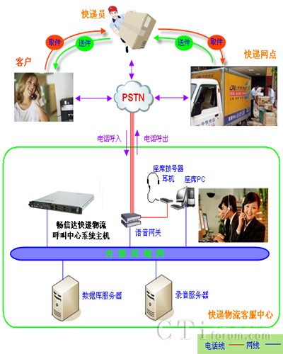 暢信達快遞物流呼叫中心系統是以暢信達快遞物流呼叫中心系統主機為呼叫交換和業(yè)務受理平臺,選配數據庫服務器和錄音服務器,采用人工座席接聽來電與發(fā)起呼叫,系統架構圖如下: