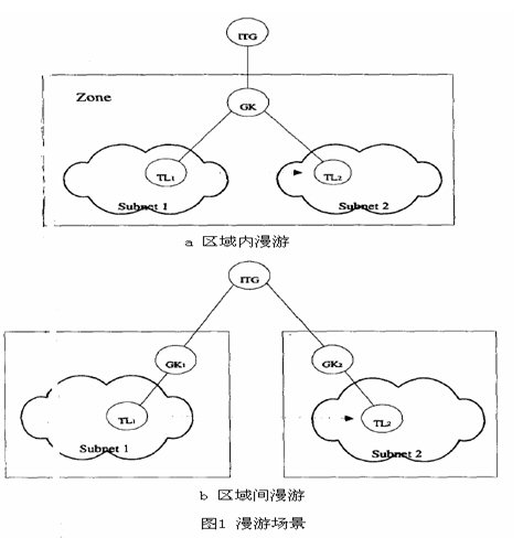 H.323定義中,區(qū)域指由H.323實(shí)體(終端、ITG、MCU)組成的集合,并由一個(gè)網(wǎng)守進(jìn)行管理。每一個(gè)區(qū)域只有一個(gè)網(wǎng)守,但允許多個(gè)子網(wǎng)通過路由器連接進(jìn)來。對(duì)于這種多子網(wǎng)單網(wǎng)守的特性,我們發(fā)現(xiàn)這與GSM系統(tǒng)中的服務(wù)區(qū)類似,網(wǎng)守就相關(guān)于HLR或者VLR。服務(wù)區(qū)中有移動(dòng)電話終端和代理管理下的基站,類似的一個(gè)區(qū)域中有多個(gè)子網(wǎng)并都在一個(gè)網(wǎng)守的管理下。當(dāng)移動(dòng)IP電話從一個(gè)子網(wǎng)漫游到另外一個(gè)子網(wǎng)時(shí),IP電話的IP地址就發(fā)生了變化。如果不做移交處理的話,連接將中斷。
