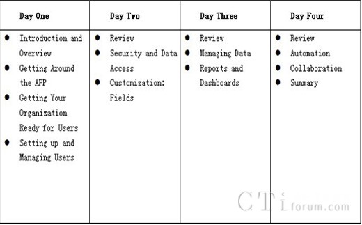 CRM 管理員是一個公司利用Salesforce CRM取得成功的關鍵。Administration Essentials培訓,您將會獲得工作中所需的核心知識。向專家學習,并獲得您所需要的技能,贏得獨家salesforce.com認證。    馬上成為Salesforce.com認證管理員!這種全面又易上手的課程是Salesforce CRM 管理員所必須的。 Administration Essentials培訓,確保您利用Salesforce獲得成功,我們建議管理員開始Salesforce部署或接管現(xiàn)有的部署時,先接受這門課程的培訓。現(xiàn)在參加報名培訓,還有ADM考試的報名優(yōu)惠券喲!