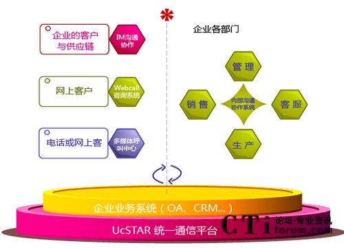 UcSTAR統(tǒng)一通信平臺是為企業(yè)提供從內(nèi)部溝通、協(xié)作與外部服務(wù)于一體的高效通信通道,并與企業(yè)的業(yè)務(wù)系統(tǒng)融合,實(shí)現(xiàn)統(tǒng)一通訊、統(tǒng)一登錄、統(tǒng)一消息、統(tǒng)一門戶的統(tǒng)一工作平臺。