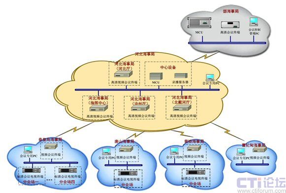 由于前期視頻會(huì)議系統(tǒng)測(cè)試時(shí)表現(xiàn)出來(lái)的良好的兼容性和出色的視音頻效果,河北海事局采用了迪威公司的高清產(chǎn)品及解決方案。按照組織機(jī)構(gòu)的分級(jí)結(jié)構(gòu),部海事局采用現(xiàn)有的高清MCU和本局部的高清終端;河北海事局部署高清MCU,既能召開本地視頻會(huì)議,又能與部海事局進(jìn)行級(jí)聯(lián),實(shí)現(xiàn)召開大會(huì)的要求,同時(shí)在本地的指揮中心、各會(huì)場(chǎng)放置1臺(tái)高清會(huì)議終端,在下屬海事處配置1臺(tái)標(biāo)清會(huì)議終端。