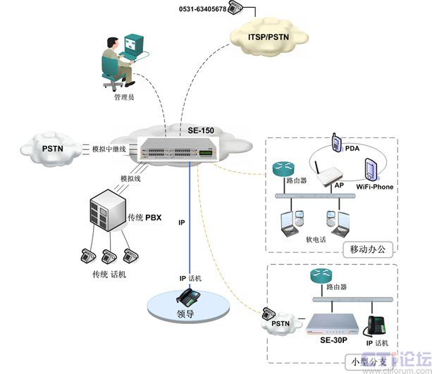 在企業(yè)總部可以部署一臺(tái)IP-PBX(如SE150)作為核心設(shè)備,通過(guò)模擬中繼接口連接PSTN電話網(wǎng),通過(guò)模擬分機(jī)接口連接企業(yè)原有的PBX交換機(jī),再通過(guò)IP話機(jī)或網(wǎng)關(guān)來(lái)擴(kuò)展新增用戶。IP-PBX下的分機(jī)用戶可以通過(guò)模擬中繼連接外線電話,也可以通過(guò)IP中繼連接到ITSP的NGN平臺(tái)實(shí)現(xiàn)外線呼叫,系統(tǒng)通過(guò)路由設(shè)定來(lái)自動(dòng)判斷分機(jī)的對(duì)外呼叫應(yīng)該由哪條中繼處理,實(shí)現(xiàn)最優(yōu)路由和話費(fèi)的最大節(jié)省。