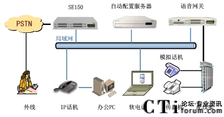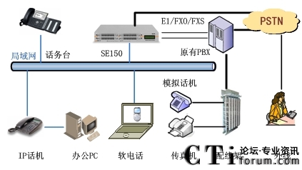 此方案適用于已經(jīng)部署了傳統(tǒng)PBX的企業(yè)。要求企業(yè)部署好數(shù)據(jù)網(wǎng)絡(luò),如果采用模擬終端,則企業(yè)的各個(gè)辦公點(diǎn)需要先將網(wǎng)絡(luò)線路和電話線路部署到位,同時(shí)企業(yè)原有的PBX要預(yù)留與SE150對接的接口。