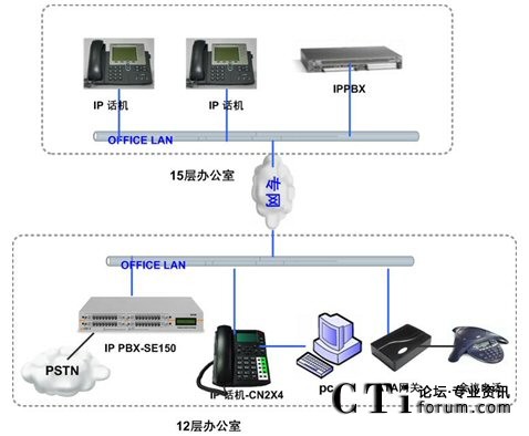 隨著企業(yè)規(guī)模的不斷擴(kuò)展,公司在15層新增約50人的辦公區(qū),需要和12層實(shí)現(xiàn)內(nèi)部通訊免費(fèi)(直撥分機(jī)號(hào)碼),出局路由沿用現(xiàn)有ISDN線路,F(xiàn)有的傳統(tǒng)的集團(tuán)電話設(shè)備已經(jīng)滿配,無(wú)法適應(yīng)企業(yè)規(guī)模的擴(kuò)張,無(wú)法跨地域組網(wǎng),不能建立多點(diǎn)分布式的內(nèi)部電話系統(tǒng),不能充分利用現(xiàn)有的IP網(wǎng)絡(luò)資源發(fā)展有助于提高企業(yè)競(jìng)爭(zhēng)力的網(wǎng)絡(luò)增值業(yè)務(wù)。
