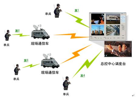在具體應(yīng)用中,工作人員(士兵)攜帶單兵背負(fù)終端深入現(xiàn)場(災(zāi)區(qū)、廣場、戰(zhàn)場等),將現(xiàn)場視頻實(shí)時回傳到后方的應(yīng)急通信車或指揮中心,同時現(xiàn)場人員可以和指揮中心建立雙向語音通信,指揮中心根據(jù)現(xiàn)場真實(shí)的視頻信息并結(jié)合現(xiàn)場人員語音匯報(bào),可以做出更有針對性、更具準(zhǔn)確性的指揮決策。