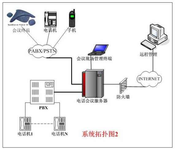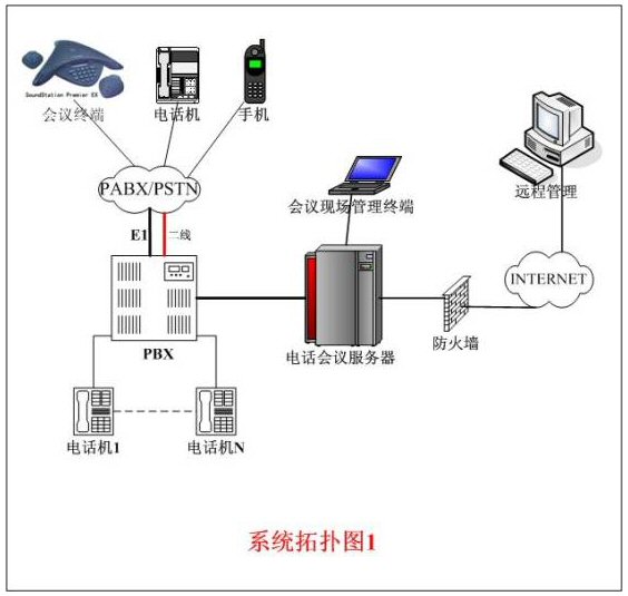 整個(gè)系統(tǒng)的拓?fù)浣Y(jié)構(gòu)一般有以上兩種連接方式,拓?fù)浣Y(jié)構(gòu)如上圖所示。圖1中的用戶(hù)交換機(jī)直接和公網(wǎng)PSTN或電信交換機(jī)相連。異地與會(huì)者必須先進(jìn)入用戶(hù)交換機(jī)后,再進(jìn)入電話會(huì)議主機(jī)。圖2中的連接方式是把電話會(huì)議系統(tǒng)主機(jī)直接和公網(wǎng)PSTN或電信交換機(jī)相連,異地與會(huì)者直接通過(guò)公網(wǎng)進(jìn)入電話會(huì)議主機(jī)。