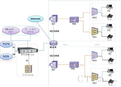 震有科技根據(jù)行業(yè)客戶(hù)的需求,推出了“NC5200系列產(chǎn)品+xPON產(chǎn)品”的行業(yè)接入網(wǎng)綜合應(yīng)用解決方案,即“NGN+xPON”行業(yè)應(yīng)用解決方案。該方案主要采用了NGN架構(gòu)的軟交換技術(shù)與xPON技術(shù)相結(jié)合,實(shí)現(xiàn)了從傳統(tǒng)的接入網(wǎng)向光纖接入網(wǎng)平滑過(guò)渡升級(jí)。該解決方案中NC5200系列產(chǎn)品主要完成語(yǔ)音交換及與語(yǔ)音相關(guān)的增值業(yè)務(wù)功能;xPON產(chǎn)品在該方案中作為語(yǔ)音、數(shù)據(jù)、視頻業(yè)務(wù)的承載平臺(tái),主要滿(mǎn)足了語(yǔ)音、數(shù)據(jù)及CATV或IPTV綜合業(yè)務(wù)接入要求。