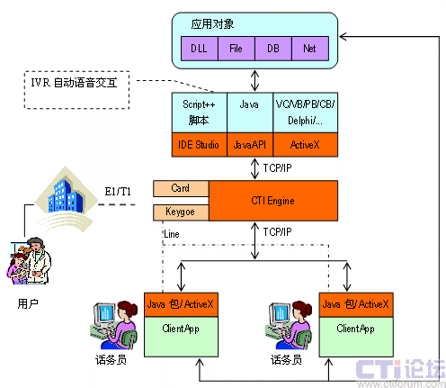 IVR部分,編寫Script++腳本程序或VC/VB/Delphi/PB/Java應用程序控制電路的接續(xù)以及放音、錄音收碼、轉移等。