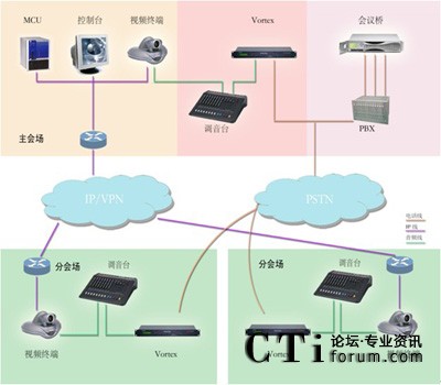 系統(tǒng)基于PSTN電話網(wǎng)絡, 在視頻會議系統(tǒng)中心會場配備一套POLYCOM VORTEX EF2241與會場調(diào)音臺聯(lián)結(jié),并根據(jù)會場數(shù)量配備一套相應方數(shù)的音頻會議橋,各分會場分別配備一套POLYCOM VORTEX EF2211與會場調(diào)音臺聯(lián)結(jié),如用戶無線路條件,也可使用當?shù)剡\營商的電話會議平臺。