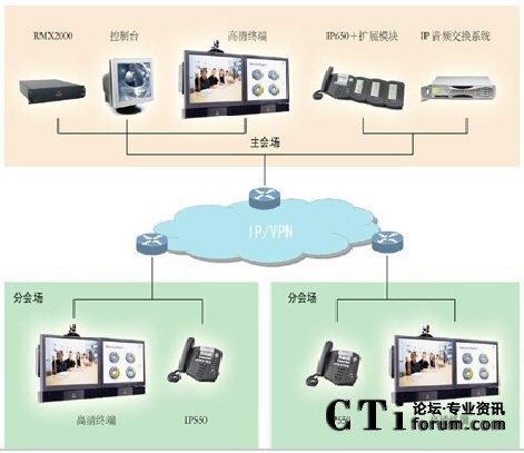 每個(gè)會(huì)場分配一個(gè)專用的IP地址,終端設(shè)置一部Polycom IP550電話, 在中心會(huì)場的指揮電話及擴(kuò)展模塊上設(shè)置每個(gè)分會(huì)場快速呼叫功能鍵,中心會(huì)場的管理人員只需按下IP650及擴(kuò)展模塊上的對(duì)應(yīng)于各分會(huì)場的快捷按鍵,即可迅速接通各個(gè)分會(huì)場。