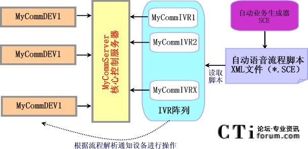 MyCommServer:核心控制服務(wù)器。實(shí)現(xiàn)對呼叫的控制,和管理DEV設(shè)備控制器和IVR流程解析器等周邊設(shè)備。