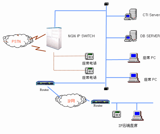第一期工程,采用ISDN PRI信令接入方式,已上線(xiàn)24坐席運(yùn)行。二期工程,單框可平滑升級(jí)擴(kuò)容到348個(gè)坐席。