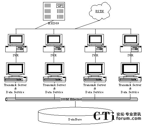 語音接入處理部分主要完成用戶的語音話路接入功能。其中:HXD09語音交換機可以支持七號信令和一號信令的數(shù)字E1線路的接入。HXD09的IVR完成自動業(yè)務受理功能,實現(xiàn)系統(tǒng)7*24小時不間斷服務。CTI完成對排隊機的監(jiān)視、控制任務,并能夠?qū)崟r的提供每個語音通道的信息配合IVR完成自動繳費業(yè)務的實現(xiàn)。