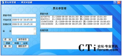 可以將多次惡意騷擾、誤撥的電話,加入到黑名單中,可設定鎖定時限,并可查詢管理屏蔽列表和過期列表。