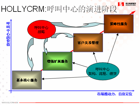 其次,我們認(rèn)為企業(yè)呼叫中心的建設(shè)不可能一次到位,而是一個(gè)持續(xù)改進(jìn)和不斷完善的過程。企業(yè)建設(shè)呼叫中心將是一個(gè)分階段分步驟的建設(shè)過程,將在其規(guī)劃的呼叫中心戰(zhàn)略的指引下和呼叫中心架構(gòu)、流程和績效的支撐上會(huì)經(jīng)歷基本核心服務(wù)、增強(qiáng)擴(kuò)展服務(wù)、客戶關(guān)系管理和策略性服務(wù)等幾個(gè)主要的階段,這就需要前期做好整體規(guī)劃,然后分階段實(shí)施,確保前期投資在后期依然可用就非常重要了,具體如下圖所示: