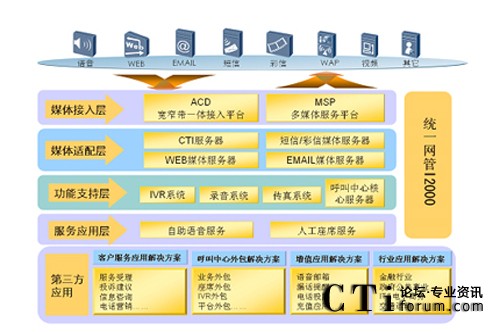 華為多媒體聯(lián)絡(luò)中心系統(tǒng)不僅支持普通語音呼叫的接入,還支持Email、Fax、短信、視頻等多種媒體呼叫接入,以及通過Web方式發(fā)起的護航瀏覽、點擊通話、文字交談等呼叫的接入,以語音、文字、圖像等多種媒體的組合為客戶提供多通道的服務(wù)。用戶可以同時通過語音、圖像、文字多種形式與聯(lián)絡(luò)中心的業(yè)務(wù)代表進行交互,極大的拓寬了用戶與業(yè)務(wù)代表之間信息交互的空間,提高了信息交互的效率。