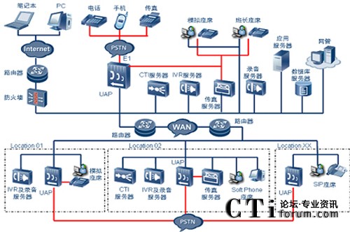 華為多媒體聯(lián)絡(luò)中心提供完善的分布式組網(wǎng)及集中式組網(wǎng)功能,可以提供分布式接入、分布式IVR、分布式錄音系統(tǒng)、分布式坐席、分布式傳真系統(tǒng)及網(wǎng)絡(luò)呼叫中心技術(shù)。如果各個分支機構(gòu)有較多本地化業(yè)務(wù)需求的時候,各個分支機構(gòu)只需要再配置一臺CTI服務(wù)器,就可以升級成完整的聯(lián)絡(luò)中心系統(tǒng),可以單獨開展豐富的個性化業(yè)務(wù)。如果總部再安裝一套網(wǎng)絡(luò)呼叫中心,則可以實現(xiàn)聯(lián)絡(luò)中心的互連,即網(wǎng)絡(luò)呼叫中心。