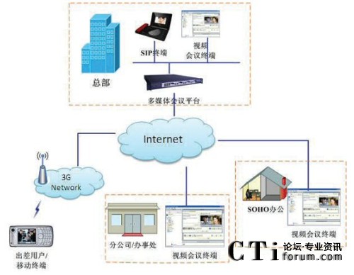 本系統(tǒng)通常將會(huì)議系統(tǒng)安裝于公司總部,應(yīng)用服務(wù)器與媒體服務(wù)器全部實(shí)現(xiàn)雙掛,同時(shí)接入公司內(nèi)網(wǎng)和公網(wǎng)。各分公司安裝的視頻數(shù)據(jù)會(huì)議終端、SIP話機(jī),通過Internet或?qū)>聯(lián)接到總部會(huì)議服務(wù)器的公網(wǎng)出口。公司內(nèi)部辦公室、會(huì)議室的視頻數(shù)據(jù)會(huì)議終端、SIP話機(jī),通過局域網(wǎng)連接到會(huì)議服務(wù)器。會(huì)議服務(wù)器通配合IPPBX、語音網(wǎng)關(guān),接入外線,實(shí)現(xiàn)普通電話和手機(jī)接入會(huì)議。全面支持IP電話和模擬電話。當(dāng)遠(yuǎn)程用戶沒有條件進(jìn)行視頻數(shù)據(jù)會(huì)議時(shí),可以單獨(dú)使用音頻,或者音頻+數(shù)據(jù)的方式進(jìn)行會(huì)議,以保證在網(wǎng)絡(luò)條件很差時(shí)也能夠進(jìn)行協(xié)同辦公。本系統(tǒng)采用不同級(jí)別的IPPBX或語音網(wǎng)關(guān)直連FXO口接入PSTN市話,保留了傳統(tǒng)的模擬電話線路。