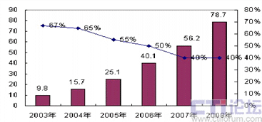 圖1-1 2004-2008年中國BSM軟件市場規(guī)模與增長趨勢數(shù)據(jù)(數(shù)據(jù)來源:賽迪顧問)