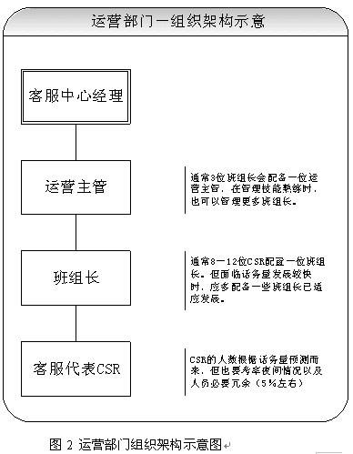 關(guān)于團(tuán)隊(duì)的建設(shè),應(yīng)該首先考慮組織架構(gòu)的設(shè)立。從運(yùn)營(yíng)角度講,設(shè)置客服中心經(jīng)理、運(yùn)營(yíng)主管、班組長(zhǎng)、客服代表都是必須的。當(dāng)然根據(jù)不同的規(guī)模,也可以增加或者減少層級(jí)。具體建議請(qǐng)見(jiàn)圖2所示。除了運(yùn)營(yíng)之外,對(duì)于大型呼叫中心(50坐席以上,或者業(yè)務(wù)較為復(fù)雜的),也應(yīng)考慮相關(guān)部門(mén)的設(shè)立。比如客戶(hù)關(guān)注組,可以負(fù)責(zé)疑難問(wèn)題解決、工單流轉(zhuǎn)、投訴處理、建議處理、知識(shí)庫(kù)建設(shè)采編等等;培訓(xùn)組可以負(fù)責(zé)管理、組織、實(shí)施員工培訓(xùn);技術(shù)維護(hù)組可以負(fù)責(zé)系統(tǒng)維護(hù)、網(wǎng)絡(luò)維護(hù)、新項(xiàng)目應(yīng)用界面開(kāi)發(fā)、部分系統(tǒng)優(yōu)化;綜合行政可以負(fù)責(zé)人事、行政等事務(wù)。