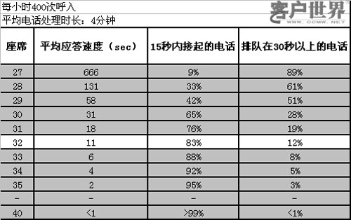 然而,圖3從客戶感受的角度來分析問題。從客戶的角度來看,客戶聯(lián)絡(luò)中心提供的服務(wù)并沒有達(dá)到他們期望。對于每個來電者最首要的問題是要求在幾秒鐘內(nèi)接通電話。如果所有的座席都忙碌,這種可能性就會大大降低了。如果在線座席代表數(shù)量不足,則平均排隊時間就會增加,這將導(dǎo)致客戶的不滿,進(jìn)而將他們的業(yè)務(wù)轉(zhuǎn)向別處。
