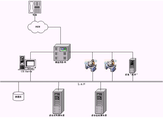 IVR模式是最常見的一種模式,這種模式也可以結(jié)合應用到前端以交換機接入的系統(tǒng)中去,在系統(tǒng)的IVR服務流程上,做出相應的修改,加入語音識別技術(shù),同樣可以得到成功應用。另外一種模式暫且稱它為后備模式,該模式一個主要的特點是放在后端,比如在有座席接聽的情況下,采用語音識別技術(shù)的系統(tǒng)不被激活,也就是系統(tǒng)不給派線。當系統(tǒng)繁忙,而座席都占用的情況下,系統(tǒng)派線到采用語音識別技術(shù)的系統(tǒng),如同一個備用的座席。在這樣一個"座席"的軟件設計上,如同與人的交談一樣,系統(tǒng)也提出正常的詢問,但必須強調(diào)引導用戶來按照事先設定好的流程進行。這樣可以保證系統(tǒng)的接通率,特別是在一些對接通率和服務及時性要求比較高的場合采用,典型的代表如電信114查號臺和移動的1860客服中心,這些系統(tǒng)往往是隨著用戶急劇增加,撥打量也在穩(wěn)步上升,而呼叫響應要求及時。系統(tǒng)拓撲結(jié)構(gòu)如下圖示。