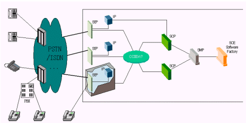 該智能網主要由業(yè)務交換點(SSP)、智能外設(IP)、業(yè)務控制點(SCP)、業(yè)務管理點(SMP)、業(yè)務生成環(huán)境(SCE)等幾個部分構成。