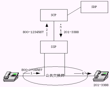 該圖示業(yè)務工作過程如下:(1)主叫用戶撥800號號碼,(2)SSP向SCP查詢800號號碼,(3)SCP查詢數據庫后向SSP送回譯碼結果(真正被叫號碼),(4)SSP連接主、被叫,振鈴。
