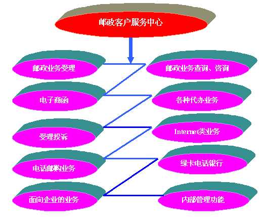 郵政呼叫中心在現(xiàn)有郵政綜合網(wǎng)的基礎(chǔ)上,利用電話服務(wù)廣泛普及,方便快捷的優(yōu)點(diǎn),采用CTI技術(shù),把綜合網(wǎng)提供的諸多并行的多種業(yè)務(wù)無縫集成,為綜合網(wǎng)提供一個(gè)集成多種服務(wù)功能為一體的橫向服務(wù)。