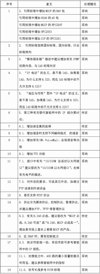 附表:8月1日~2日,網(wǎng)絡(luò)與交換標準研究組對于“基于軟交換的媒體服務(wù)器的技術(shù)要求”的征求意見選登。
