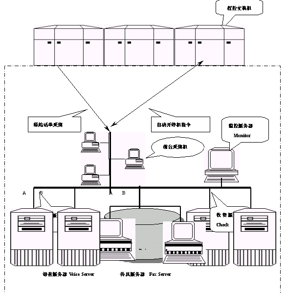 本系統(tǒng)可以分為:話單采集傳輸子系統(tǒng)、計(jì)費(fèi)帳務(wù)處理子系統(tǒng)、收費(fèi)服務(wù)子系統(tǒng)、語(yǔ)音查詢(xún)充值子系統(tǒng)、自動(dòng)開(kāi)停機(jī)子系統(tǒng)和監(jiān)控服務(wù)子系統(tǒng)六個(gè)模塊。
