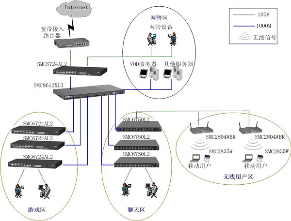 本方案采用"千兆光纖干線,百兆交換到桌面"的設(shè)計思路,各骨干線路均為1000M。骨干網(wǎng)通過高速線路接入INTERNET,網(wǎng)吧內(nèi)實(shí)現(xiàn)主干千兆交換、百兆到點(diǎn),整個網(wǎng)吧內(nèi)實(shí)現(xiàn)無阻塞通信。根據(jù)顧客的不同消費(fèi)需求,將網(wǎng)吧分為了網(wǎng)絡(luò)游戲區(qū)、聊天區(qū)、貴賓區(qū)等,根據(jù)不同區(qū)域的特點(diǎn),細(xì)化了不同網(wǎng)絡(luò)的解決方案。方案中采用的核心設(shè)備和二層設(shè)備都支持802.1Q標(biāo)準(zhǔn)VLAN和IGMP組播協(xié)議,為VOD、多媒體娛樂等豐富應(yīng)用的開展打下了堅實(shí)的基礎(chǔ) 。通過劃分VLAN,MAC地址綁定來劃分了不同類型用戶,很好地滿足網(wǎng)吧的各項(xiàng)業(yè)務(wù)應(yīng)用需求。此外,SMC的豐富無線網(wǎng)絡(luò)產(chǎn)品可以很靈活的滿足網(wǎng)吧的組網(wǎng)需求,投資少、施工快。在提供高性能的同時,還保證很好的安全性,既支持基于802.11b標(biāo)準(zhǔn)的安全機(jī)制,又支持動態(tài)安全鏈路,以及基于802.1x的增強(qiáng)性安全或認(rèn)證功能。