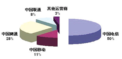 2005年中國NGN收入的主要的市場份額獲得者是在固網(wǎng)資源上有絕對優(yōu)勢地位的中國電信,其次是網(wǎng)通,2006年以后隨著3G網(wǎng)絡的部署,廣義的NGN業(yè)務的收入上,中國移動的市場份額會逐步上升。