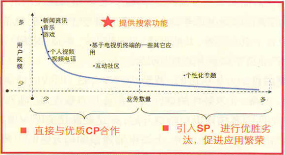 而尾部內(nèi)容則可以引入SP,進(jìn)行優(yōu)勝劣汰,促進(jìn)應(yīng)用。相對頭部大眾化的需求應(yīng)用,這部分的投入產(chǎn)出比要低,而電信的營銷資源有限,應(yīng)該把主要力量放在頭部內(nèi)容的營銷。