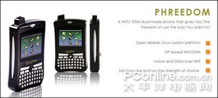 GUPP公司PHREEDOM手機基于VoWifi/GSM雙模的手機可以讓用戶自由選擇網(wǎng)絡(luò)。除了正常的GSM網(wǎng)絡(luò)之外,在有WiFi覆蓋的地方,用戶便可以使用WiFi網(wǎng)絡(luò)進行通話,從而節(jié)約話費。在WiFi環(huán)境中,它還也可以進行網(wǎng)頁瀏覽、郵件收發(fā)、數(shù)據(jù)下載等操作。
