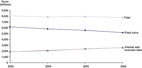 但問(wèn)題是,在發(fā)達(dá)國(guó)家,用戶(hù)寬帶接入市場(chǎng)已經(jīng)接近飽和。正因?yàn)槭沁@樣一種情況,所以用戶(hù)數(shù)量也就很難再有增加。ARPU值在極大的競(jìng)爭(zhēng)壓力下也很難有很大的突破。一切都靜止不動(dòng),固話(huà)收入持續(xù)下降,所以圖中的“'Internet