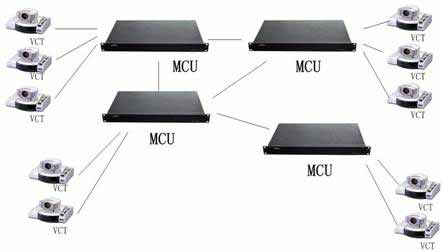 多MCU連接星型組網(wǎng)結(jié)構(gòu)見圖所示,其中VCT是視頻會議終端VideoConferenceTerminal的縮寫