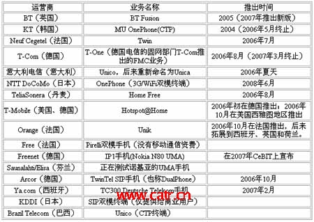 2008年,基于融合性終端的FMC業(yè)務(wù)備受矚目,BT、法國(guó)電信、德國(guó)電信、NTT DoCoMo等運(yùn)營(yíng)商利用UMA技術(shù),提供基于WiFi/GSM或者WiFi/WCDMA雙模終端的FMC業(yè)務(wù),市場(chǎng)反映良好,被運(yùn)營(yíng)商作為未來(lái)重點(diǎn)發(fā)展的業(yè)務(wù),預(yù)計(jì)2010年全球FMC用戶將達(dá)到3