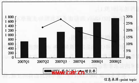 Play業(yè)務(wù),AT&T、Verizon等電信運(yùn)營(yíng)商也積極開(kāi)展IPTV業(yè)務(wù),并且用戶規(guī)模迅速增長(zhǎng),截至2008年第二季度,美國(guó)的IPTV用戶達(dá)到249萬(wàn)。亞太各個(gè)國(guó)家和地區(qū)的IPTV業(yè)務(wù)發(fā)展情況差異很大,中國(guó)香港的PCCW是目前IPTV用戶規(guī)模最大的電信運(yùn)營(yíng)商,截至2008年第二季度,PCCW的IPTV業(yè)務(wù)“now