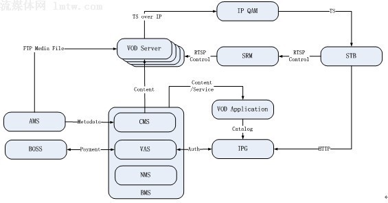 一個典型的交互電視系統(tǒng)的功能架構(gòu)以及后臺管理系統(tǒng)和周邊系統(tǒng)的關系如下圖所示,節(jié)目內(nèi)容通過AMS媒資管理系統(tǒng)饋入BMS業(yè)務管理系統(tǒng),BMS系統(tǒng)將媒體文件注入到視頻服務器VOD Server,同時將資產(chǎn)注入到業(yè)務應用系統(tǒng)Application,業(yè)務應用系統(tǒng)進行節(jié)目編排和服務綁定后再發(fā)布到互動節(jié)目導航系統(tǒng)IPG。用戶通過導航界面來選擇點播的節(jié)目,同時會話資源管理系統(tǒng)SRM 和BMS平臺在后臺工作以管理網(wǎng)絡帶寬,并與付費平臺配合確定用戶帳戶的合法性。