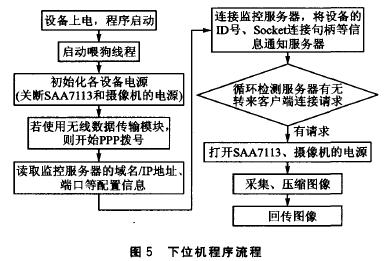 下位機(jī)軟件通過驅(qū)動(dòng)程序提供的接口,在遠(yuǎn)程圖像監(jiān)控設(shè)備中完成硬件的初始化、控制等功能,同時(shí)又負(fù)責(zé)圖像的壓縮和傳輸。它是所有設(shè)備的控制中樞,因此這里著重描述下位機(jī)軟件的工作流程,如圖5所示。