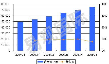 2006年第1季度中國即時通訊注冊賬戶規(guī)模達到7.4657億,相比2005年第4季度增長7.8%,為5個季度來最低。