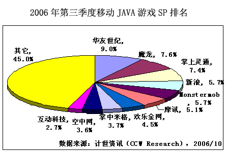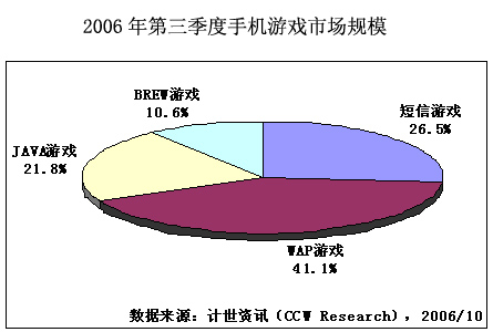 計(jì)世資訊(CCW Research)數(shù)據(jù)顯示,2006年第三季度中國(guó)手機(jī)游戲市場(chǎng)規(guī)模達(dá)到6.7億元人民幣,比第二季度增長(zhǎng)11.9%。 手機(jī)游戲市場(chǎng)規(guī)模包括移動(dòng)運(yùn)營(yíng)商、手機(jī)游戲服務(wù)提供商在手機(jī)游戲業(yè)務(wù)上的總體收入,但不包括手機(jī)游戲軟件開發(fā)商的收入。第三季度,短信游戲增速繼續(xù)放緩,短信游戲市場(chǎng)規(guī)模達(dá)到1.8億元,占手機(jī)游戲市場(chǎng)份額的26.5%。WAP,JAVA和BREW游戲繼續(xù)保持快速增長(zhǎng),第三季度WAP、JAVA和BREW游戲市場(chǎng)規(guī)模分別為2.8億元、1.4億元和0.7億元。