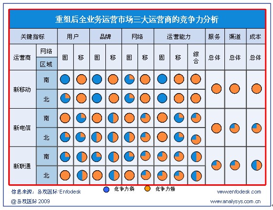 盡管產(chǎn)業(yè)鏈完備程度相差較為明顯,但運營商各自業(yè)務與用戶服務運營能力對3G時常的發(fā)展影響也至關(guān)重要,根據(jù)易觀國際Enfodesk發(fā)布的《國內(nèi)運營商3G業(yè)務發(fā)展策略研究系列—中國3G市場現(xiàn)狀與發(fā)展策略概述》報告顯示,在發(fā)展3G的過程中,三大運營商各自有一定的優(yōu)劣勢: