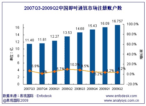 09年2季度中國(guó)即時(shí)通訊累計(jì)注冊(cè)賬戶數(shù)達(dá)16.76億