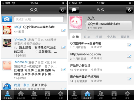 QQ空間foriPhone的外觀界面完全繼承了iPhone上應(yīng)用軟件的清新簡潔風(fēng)格,軟件主界面包括個(gè)人中心、我的主頁、好友、應(yīng)用、設(shè)置五大功能。點(diǎn)擊個(gè)人中心可以看到自己的狀態(tài)、簽名以及好友的最新動(dòng)態(tài)。并且可以直接使用置頂?shù)呐恼真I拍照,即時(shí)拍照上傳至空間,使用置頂?shù)男那檩斎肟蛴涗涀约旱男那椤?br />