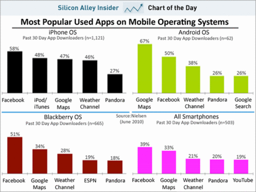 6月11日消息,據(jù)Businessinsider網(wǎng)站報(bào)道,尼爾森分析了各個(gè)智能手機(jī)平臺(tái)上最流行應(yīng)用軟件的使用情況(如圖)。從圖中可以看出,各個(gè)平臺(tái)應(yīng)用軟件的使用情況相當(dāng)一致。